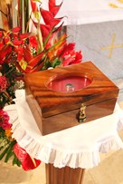 The relic of St. Damien is housed in a box manufactured from the wood of a monkey-pod tree Father Damien himself planted at Our Lady of Seven Sorrows Church in Kalua’aha, Moloka’i, one of the churches Damien built. The reliquary, about the size of a cigar box, contains sizeable bone fragments from the foot of St. Damien, which are viewed through an oval plexi-glass opening on the top of the reliquary. The dimensions of the St. Damien reliquary are as follows: