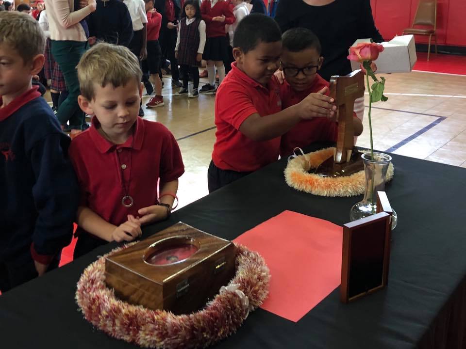 Friday, May 10th (School): Today, on St. Damien's feast day, Holy Family Parish held a school Mass where they celebrated first communion and grandparent’s tea. Later that afternoon the relics of the saints were taken to each classroom where the teachers had prepared the students ahead of time on the stories of the saints. The advanced preparation of the students allowed for a great Q&A exchange, up close and personal observation of the relics by each student, and the blessing and distribution of a combined saints prayer card to each student.