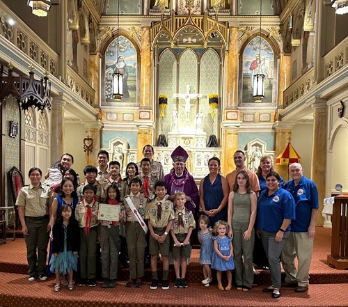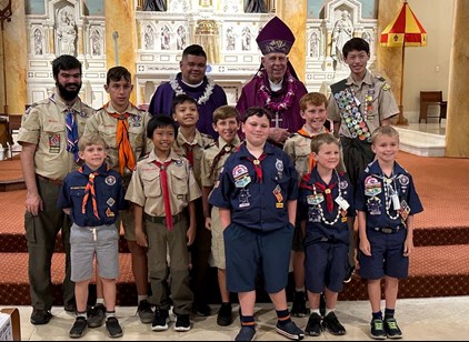 Scout Mass is held annually in February or March, the anniversaries of the founding of the Boy Scouts and Girl Scouts respectively. Bishop Larry Silva presides at the Mass and conducts a Court of Honor after Mass to honor scouts who earned religious emblems.