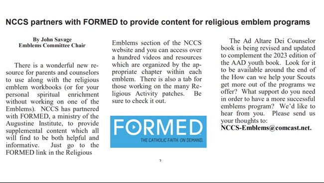 In this program, high schoolers in small groups study and discuss their role as young Catholics in today's society. Guided by the Holy Spirit, this formation can make youth more aware of their potential of being future Christian leaders. This program in Catholic Scouting underscores the development of individuals in the Christian faith through information, formation and transformation. It challenges the high school age Scout or Venturer to recognize their membership in the community of faith so as to foster a leadership role through example and responsible action, thus helping to usher in the Kingdom of God.