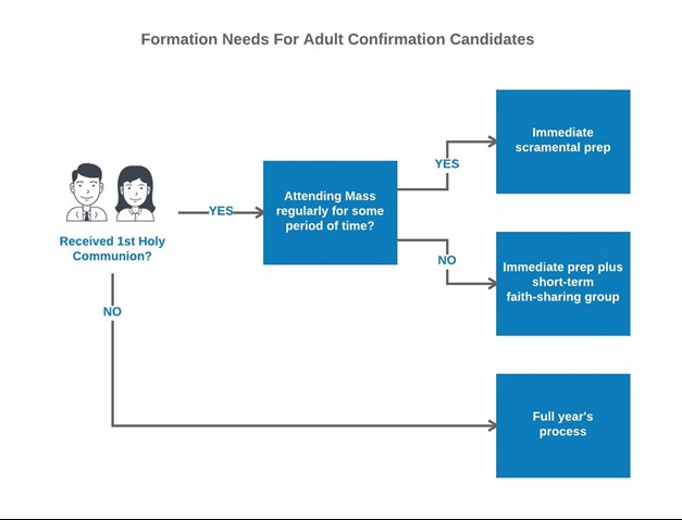 • NOTE: Catholic adults who have received First Holy Communion and who already demonstrate some evidence of a relationship with Jesus and his Church (expressed by participation in the parish) should NOT be asked to participate in a year-long OCIA process.  Knowledge of doctrines is not the primary emphasis in discerning faith formation needs - attending Mass and receiving Eucharist regularly are.
