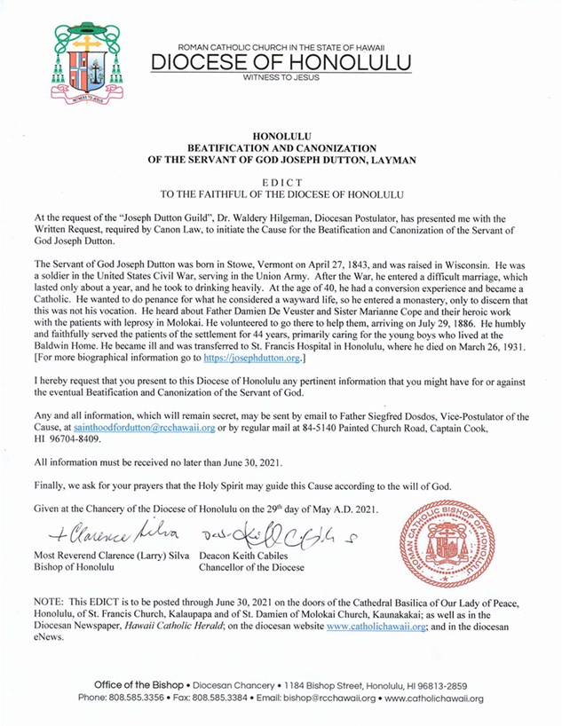 NOTE: This EDICT is to be posted through June 30, 2021 on the doors of the Cathedral Basilica of Our Lady of Peace, Honolulu, of St. Francis Church, Kalaupapa, and of St. Damien of Molokai Church, Kaunakakai; as well as in the diocesan newspaper, Hawaii Catholic Herald; on the diocesan website www.catholichawaii.org; and in the diocesan eNews.