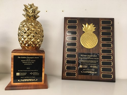 The Hawaii Catholic Schools and Chaminade University with the support of John C. and Mary Lou Brogan present the Hawaii Catholic Schools Teacher of the Year Award, The Golden Pine"apple", recognizing outstanding teachers and specialists in our schools. This award recognizes excellence in teaching within the Catholic Schools in the State of Hawaii. The recipient of the 2021-2022 school year's award will be announced at the Recognition Ceremony in May and will receive the Golden Pine”apple” trophy and a check for $1,000. Nominations are being accepted until the end of the month. Visit chaminade.edu/hawaii-catholic-schools-teacher-of-the-year for more details.