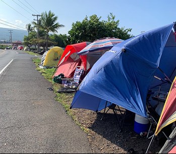The residents, who had pitched eleven tents outside the Kona Community Aquatic Center, told outreach workers they had previously taken refuge in the bushes at the Old Kona Airport Park, but were forced out when the county performed a sweep of the park ahead of a concert earlier this month. Without assistance finding shelter, the residents moved down the road, relocating to just outside the community pool.
