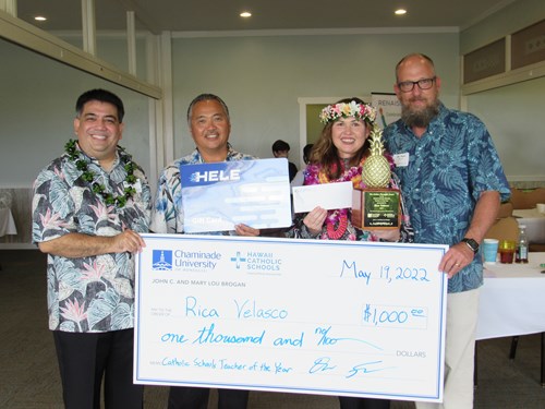 Pictured above from left to right: Dr. Llewellyn Young, Superintendent for Hawaii Catholic Schools, Par Hawaii's Vice President of Business Development Keith Yoshida, Awardee Rica Velasco, and Dr. Dale Fryxell, Dean of the School of Education and Behavioral Science at Chaminade who heads the selection committee for the Teacher of the Year Award.