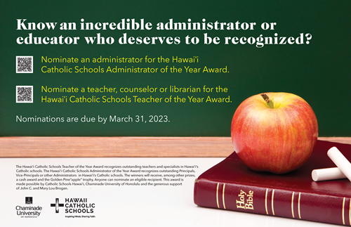 Hawaii Catholic Schools and Chaminade University with the support of John C. and Mary Lou Brogan presents the HCS Teacher of the Year Award, The Golden Pine"apple". In addition, there is a separate award for the HCS Administrator of the Year. Both awards recognize excellence in outstanding teachers/specialists and administrators within the Catholic Schools in the State of Hawaii. The recipients of the 2022-2023 school year's award will be announced at the Recognition Ceremony in May and will receive the Golden Pine”apple” trophy and a check for $1,000. Nominations are being accepted until the end of the month. For more details, click HERE for Teacher of the Year and click HERE for Administrator of the Year.