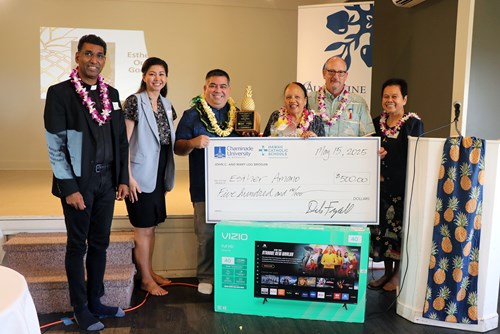 Pictured above from left to right: Father Santhosh Thottankara, SS.CC., Our Lady of Good Counsel School Principal Chantelle Luarca, Dr. Llewellyn Young, Superintendent for Hawaii Catholic Schools, Awardee Esther Amano, Dr. Dale Fryxell, Dean of the School of Education and Behavioral Science at Chaminade who heads the selection committee for the Golden Pine"apple" Awards, and Sister Davilyn Ah Chick, OSF who hired Esther to work at Our Lady of Good Counsel School.